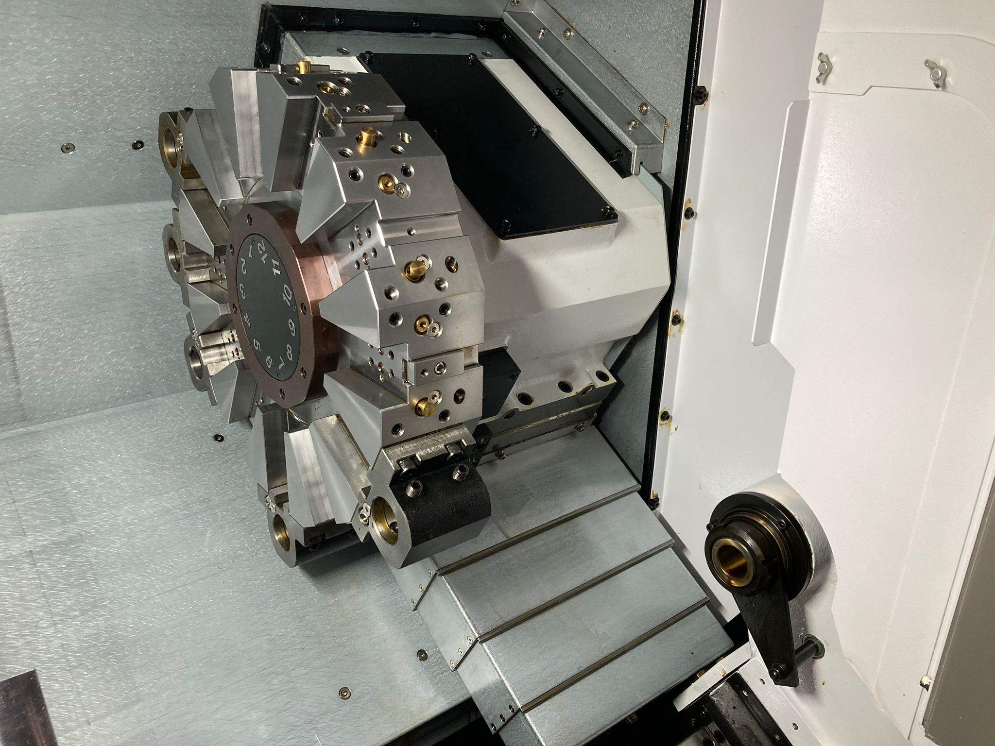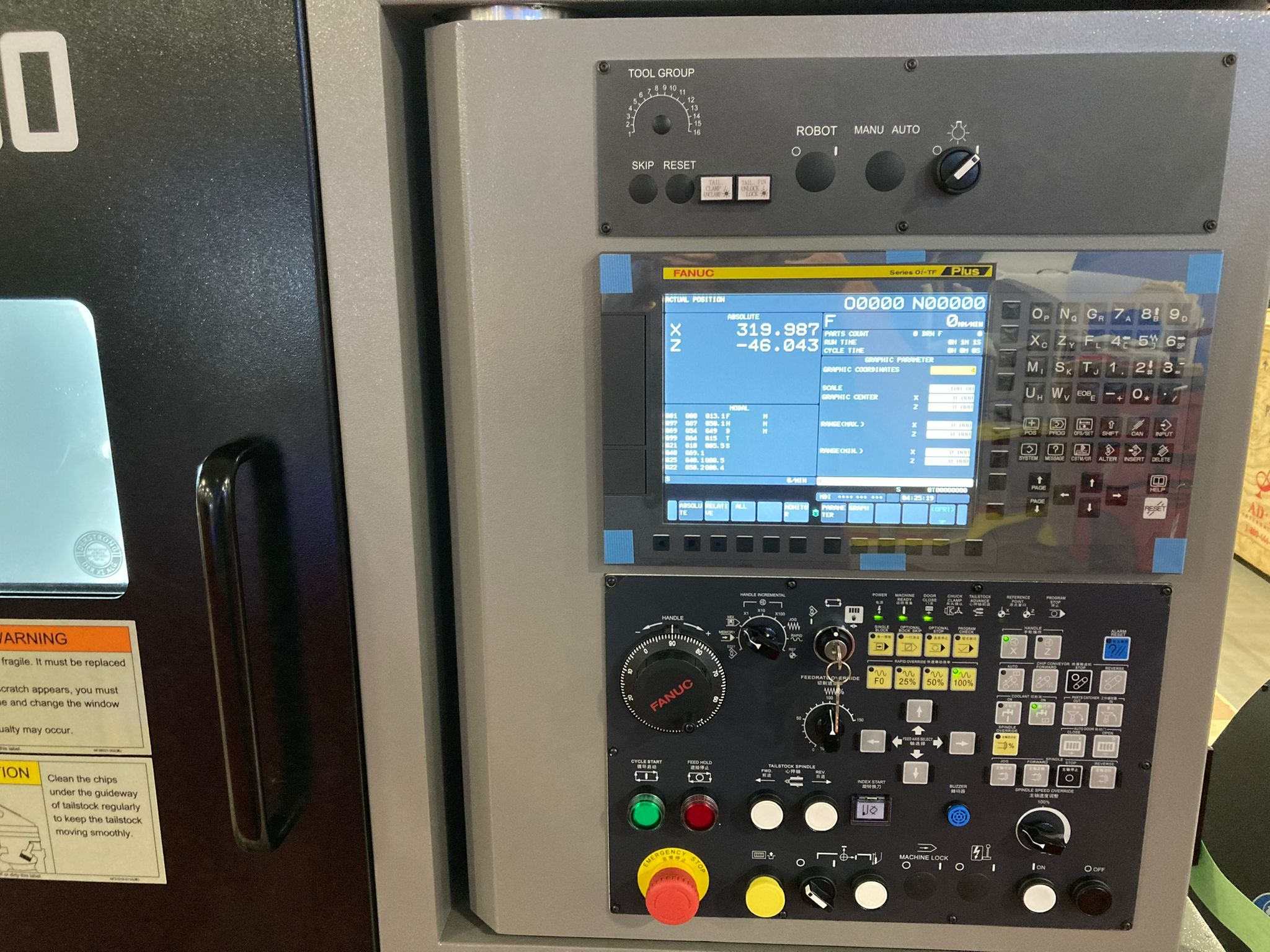 US Machine features include Automatic Tool Presetter, 10” Chuck, Tailstock positioning by carriage pin and Chip conveyer. Fanuc 0i TF CNC control
